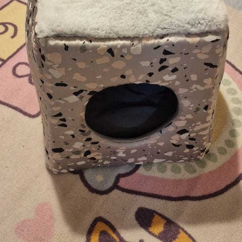 Ikean Kallax/Expedit hyllyyn sopiva kissanpesä. Kulkuaukko kissanpään muotoinen on reunustettu valkoisella pörröisellä kankaalla. Tuotteen mitat näkyy kuvassa.
