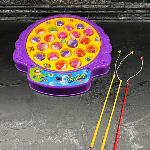 Kalapeli, toimii isolla paristolla. Mukana kaksi onkea. Kaksi kalaa puuttuu. Toimii.