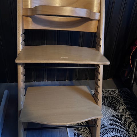 Stokke tripptrapp Syöttötuoli valkoinen. Tuoli on säädettävä ja materiaali on puuta, tarkoitettu lasten ruokailuun.