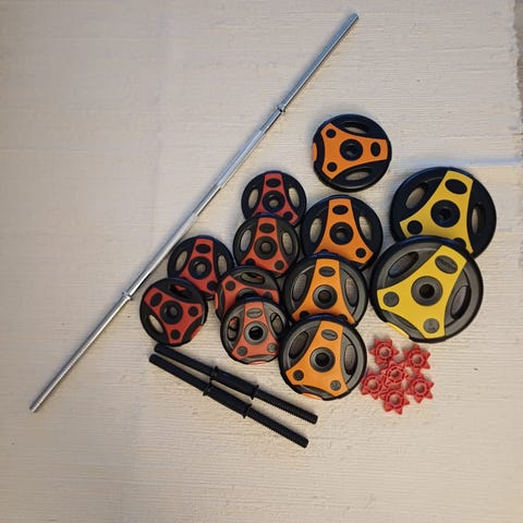 30 mm paksuinen levytanko, jonka paino on 7,5 kg. 2 x 5 kg ja 2 x 10 kg vinyylipainolevyt mukana. Kaksi painolukkoa. Ollut autotallikäytössä. Yhtä kohtaa yhdessä painolevyssä paikattu, muutoin ehjät.
