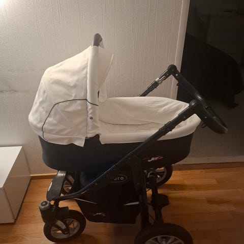Turkoosi- mustat, kankaat ovat ihan uudet, runkoa käytetty, mukaan topattu jalkapeite, toiset renkaat ja muita tarvikkeita. Työntöaisan korkeus säädettävä. Selkänoja menee makuuasentoon, portaaton selkänojasäätö. Kuomussa vetoketju, sen avaamalla saa kuomun pidemmäksi. Nouto Noormarkusta.