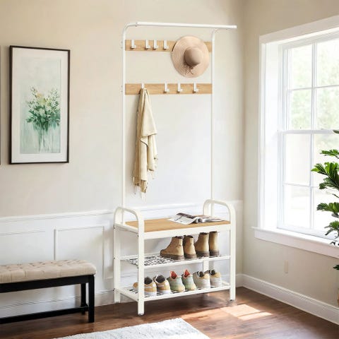 Uusi moderni ja tukeva naulakko penkillä ja kenkätelineellä.