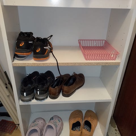 Annetaan tummanruskea kenkähylly. Keskimmäinen ei pysy kiinni ilman painoa. 61x30x 90
