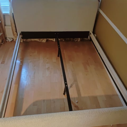 Jensen Diplomat bed frame, made of durable material. Color off-white. Suitable for a variety of bedrooms and provides a sturdy base for the mattress. The mattress is in good condition and firm; however, there are a few stains on the fabric from the previous move and a small tear in the fabric. For pick up only. Date for pick up approximately February 1, 2026, or later, depending on delivery of the new mattress.