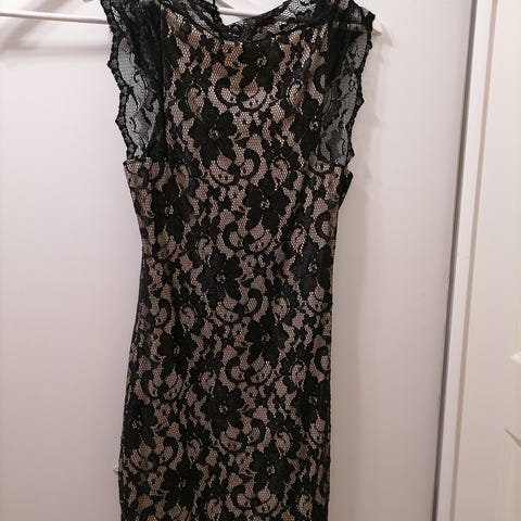 Musta mekko kultaisin yksityiskohdin ja mustin helmisomistein.