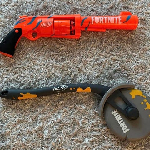 Fortnite Nerf lasten lelu, muovinen heittopeli, jossa on oranssi, harmaa ja vihreä väri. Lelu on suunniteltu lasten käyttöön.