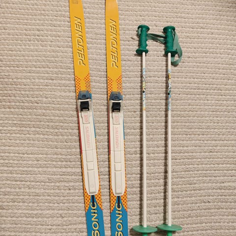 Aquarius 100 cm sukset ja sauvat 80 cm. Sukset saa kenkiin kiinni. Yksi kiinnitysnauhoista kadonnut. Sopii perinteiseen hiihtoon.