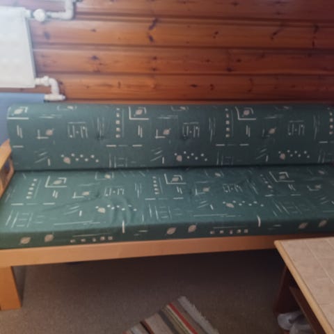 Iskun vaalea muotokulmasohva. Kangas vähän tummunut mutta tekstiilipesurilla siitä saa kuin uuden. Samaan sarjaan kuuluva jalkarahi kaupan päälle.