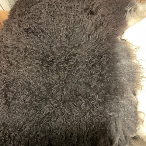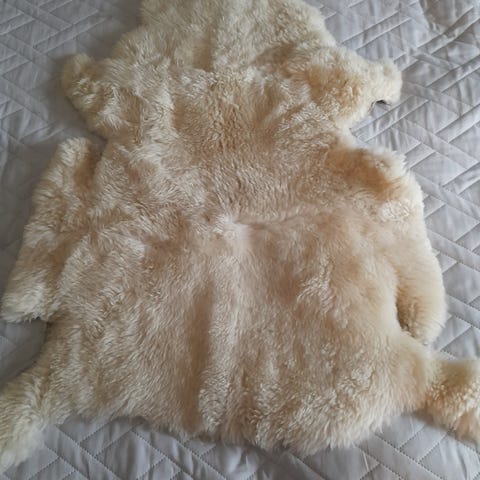 Vaalea pitkävillainen lammas talja. Koko on 70x115 cm.