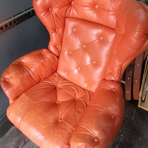 Pieni lepotuoli/nojatuoli, nahka paikoin kulunut ja venynyt, jalakset terävät joten alla mielellään matto tms ratkaisu. Keinuu