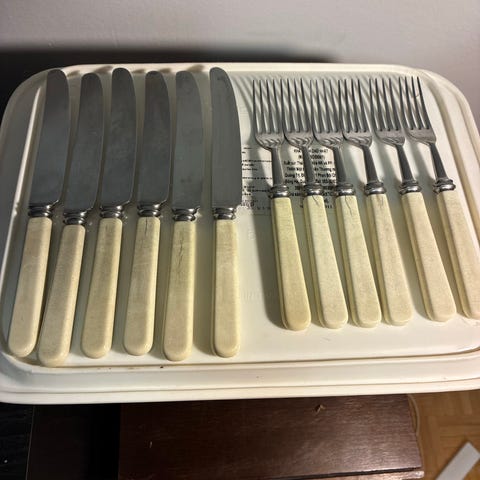 Veitsissä teräsosissa vähäistä normaalia käyttökulumaa, haarukoissa hyvin vähäistä.