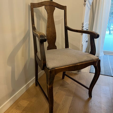 Vanha nojatuoli. Luumun sävyinen rusehtavalla irrallisella istuintyynyllä. Tuoli on todella jykevä istua. Kaikki kanttinauhat on tosin uusittava. Saa sitten muutoinkin valita mieleisensä värin nauhoille. Tuolin leveys on 73 cm. Syvyys on 65 cm. Sekä korkeutta tuolilla on 110 cm.