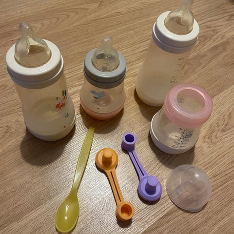 Kaksi isoa philips aventia, kaksi lansinohia, kaksi herobilityä ja kaksi Mamin pulloa. Mukaan myös yksi philips aventin maidonsäilytyspurkki.