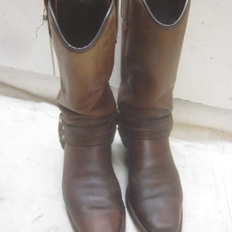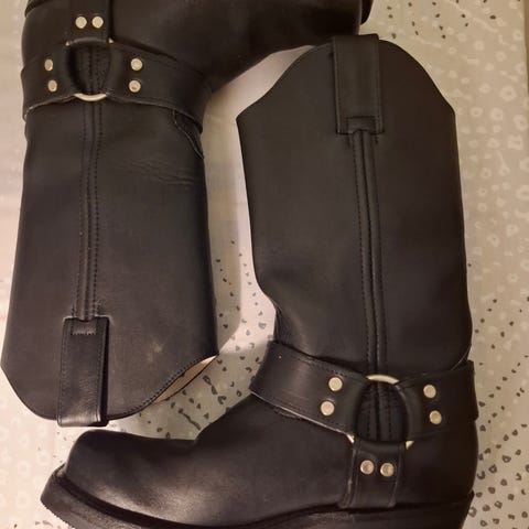 Musta nahkainen saapas, koko 40. Saapas on varustettu koristeellisella soljella .