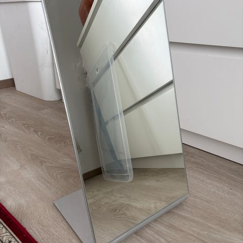 IKEA meikkipeili, hopeanvärinen, metallinen jalusta. Koko 22x39cm
