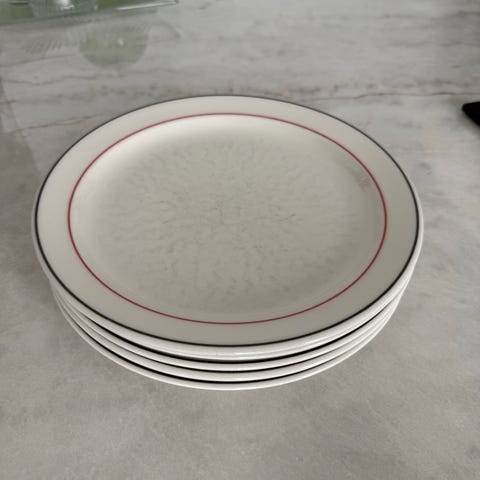 4 kpl puna/siniharmaaraitaiset lautaset, pohjassa lukee Arabia Finland, Ø 27,5 cm (huom. koko)