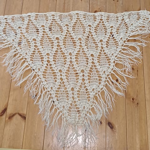 Itse kimallelangalla neulottu harmaa huivi. Pituus noin 200cm.