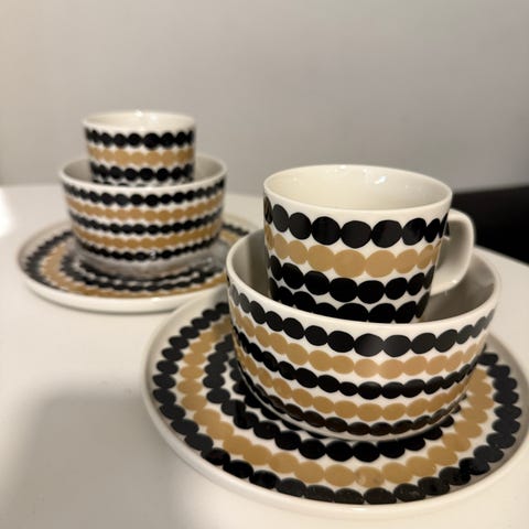 Marimekko Siirtolapuutarha räsymatto kahvikupit ja lautaset beigenä. Koko setti 70€. Kuin uudet!
