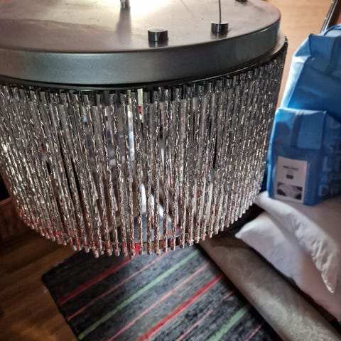 Riippuvalaisin, jossa musta kangasvarjostin ja kristallikoristeet. Valaisin on suunniteltu kattoon ripustettavaksi.