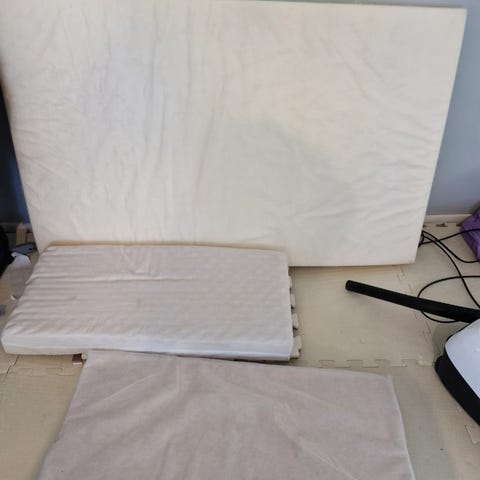 Ehjä sängynrunko (osiksi purettuna) ja Ikean Morgedal-patja. Patjassa on pestävä päällinen.