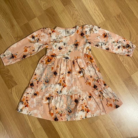 Kaikon kaunis mekko, kuosi Pastel bouquet ja koko 110/116. Erittäin siisti kunto. Savuton ja eläimetön koti, hajusteeton pyykinpesu.