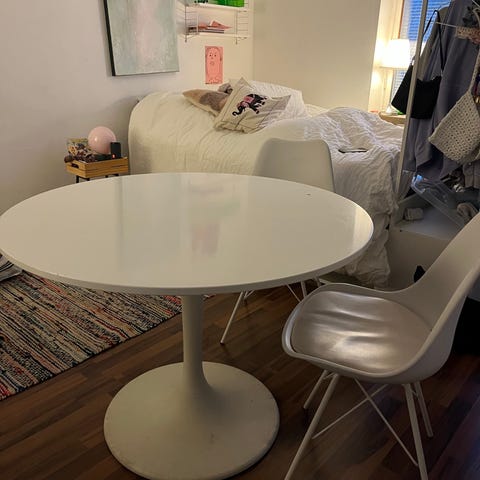 Ikean pyöreä valkoinen Liatorp ruokapöytä. Käytönjälkiä löytyy mutta tukeva ja käyttökelpoinen. Jatkettava.
