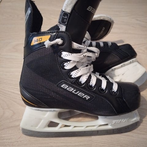 Bauer lasten hokkarit ilman nauhoja. Teroitusta kaipaavat. En löytänyt kokomerkintää mutta sisämitta n 20,5 cm, vastaa kokoa 32. Kissankarvoja voi olla.