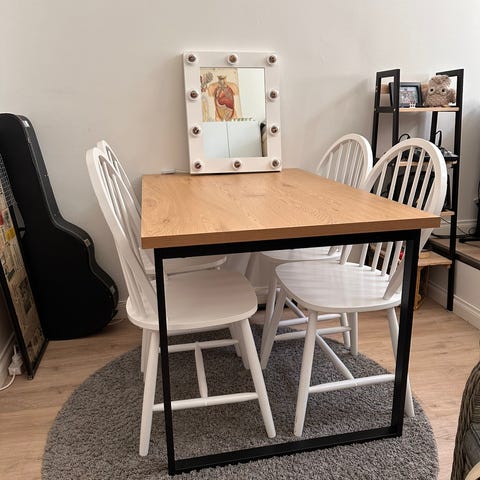 Myydään hyväkuntoinen ja täysin ehjä neljän hengen ruokapöytä. Kansi valkoinen ja jalat puunväriset.
