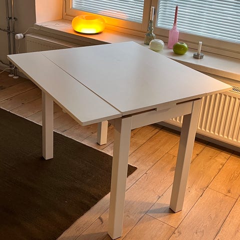 Myydään Ikeasta ostettu Bjursta-mallinen ruokapöytä, materiaali koivuviilua. Kummallakin sivulla jatkopalat, jotka saa ison levyn alle piiloon. Näppärä myös esim. sivupöytänä. Leveys levitettynä 90 cm, yhdellä jatkopalalla 70 cm ja ilman jatkopaloja 50 cm.