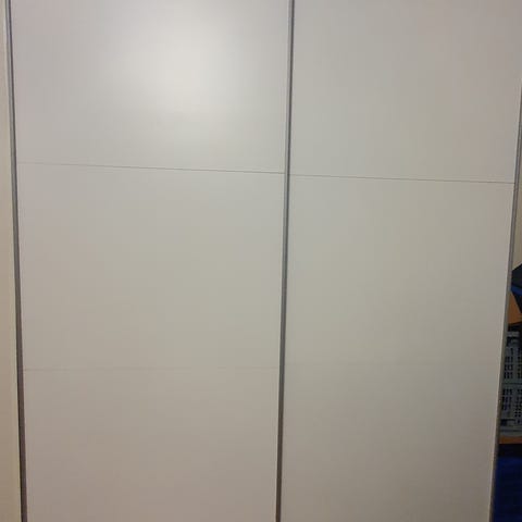 Myydään muuton alta liukuovikomero. Komero irti liitoksistaan, takalevyt jo irti ja hyllyt poistettu. Nakuttele kasaan muuten ehjä ja toimiva kaappi. Hyllyjen kannakkeet puuttuu (tai on mitä sun sattuu) ja kaapin takalevyt kaipaa nauloja. Saa vielä toimivan kaapin.