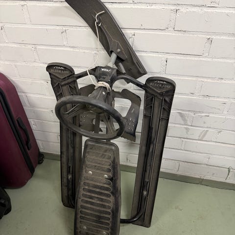Toimiva vetonaru ja jalkajarru. Vähän käytön jälkiä istuimen pinnassa sekä jalaksien pohjissa ja yksi metallivieteri ruostunut(näkyy kuvassa).