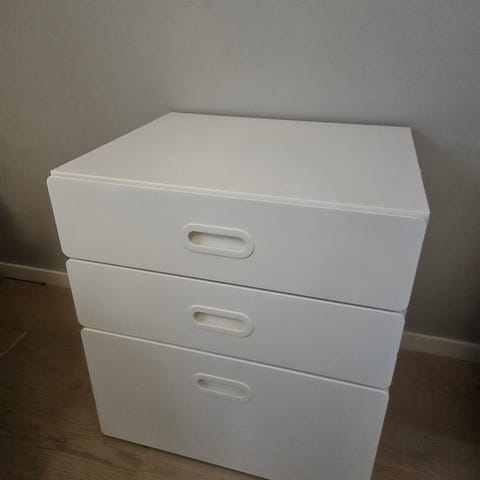 IKEA Malm lipasto, jossa on kolme valkoista laatikkoa. Lipasto vielä hyvässä kunnossa, myydään tilan puutteen vuoksi.