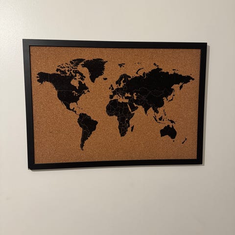 Puulevystä tms tehty maailmankartta esittävä taulu, jossa mustat osat soveltuu liitutauluksi. Hyvä kunto, oikeassa yläkulmassa pieni kolhu. Mitat 95x67 cm. Mukaan saa halutessaan pari liitua
