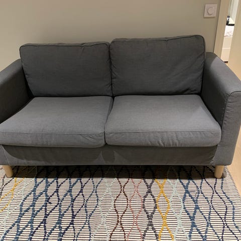 3-istuttava tummanharmaa sohva. Alunperin ostettu Sotkasta. Kankaassa vähän nukkaantumista mutta muutoin ehjä ja siisti. Noin 220cm leveä.