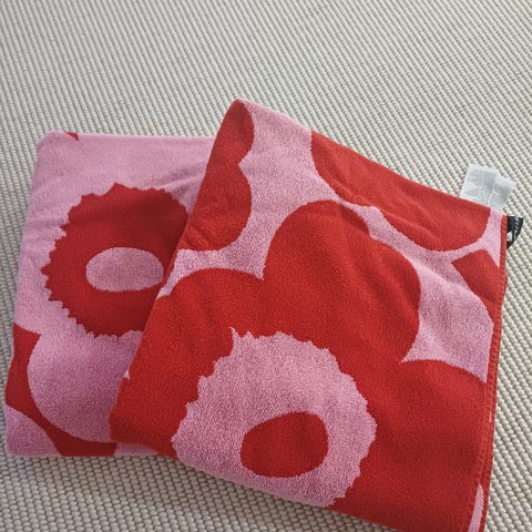Kaksi kappaletta uusia Marimekko Unikko kylpypyyhkeitä värinä punainen+pinkki, koko 70x150. Laput kiinni, eli käyttämättömiä.