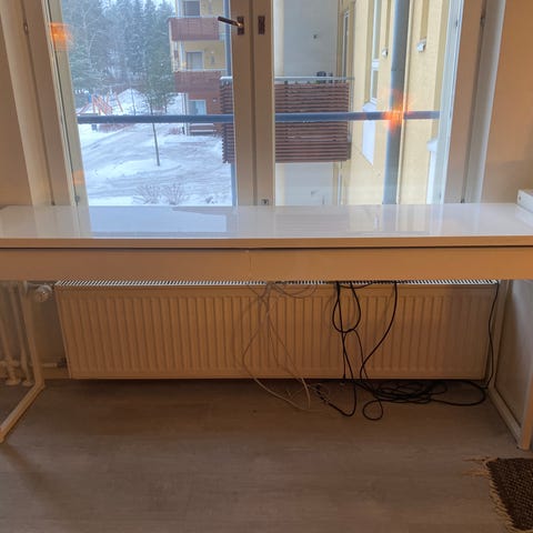 IKEA työpöytä, valkoinen väri. Työpöytä sisältää integroidun hyllyn ja laatikon. Sopii työskentelyyn ja tietokoneen käyttöön. Nouto.