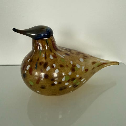 Lasikostamon tekemä valkoinen lasilintu ”kultahipuilla”.