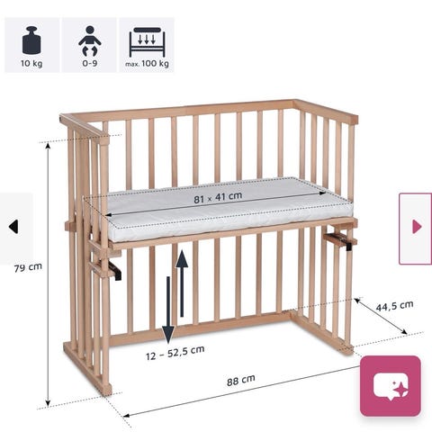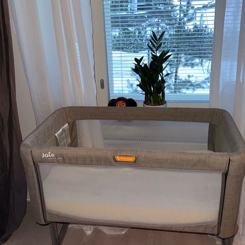 Hyväkuntoinen sivuvaunusänky, joka voidaan kiinnittää aikuisten sänkyyn tai käyttää erikseen. Sängyssä on heijausmahdollisuus, korkeuden säätö sekä kallistuksen säätö eli sängyn päätyä voi nostaa. Lukittavat pyörät.