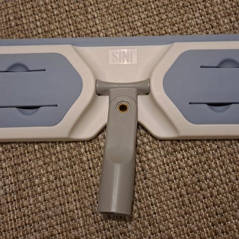 Sini-moppi. Varsi EI säädettävissä. Mopin pää hyvässä kunnossa, mutta varressa kulumaa/likaa, joka ei lähde rätillä (kuvissa näkyy).
