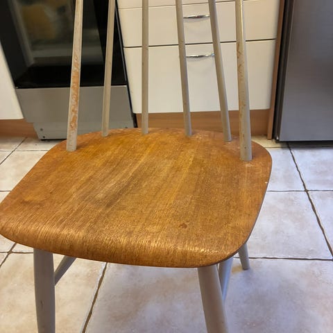 Kevyt mutta tukeva tuoli, miellyttävä ja ajaton muotoilu. Mukavuutta lisää taivutettu etureuna. Istuinkorkeus 43 cm. Reunimmainen pinna hieman löysässä yläreunasta (kuvassa) ja vahvistettu valkoisella teipillä, ei haittaa käyttöä, maalauspinnassa myös pieniä, normaaleja käytön jälkiä. Muutoin siisti ja puhdas, kotimainen tuoli, ei isoja naarmuja eikä kolhuja tms. Klassinen malli, joka sopii monenlaisiin sisustuksiin, yöpöydäksi, työpöydän pariksi tai osaksi ruokailuryhmää.