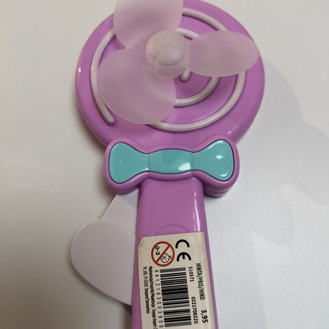 Viilennys tuuletin, jossa säiliö vedelle. Käsikäyttöinen eli tuuletin pyörii kun kammesta veivaa ja vettä voi samalla suihkuttaa. Muovia.