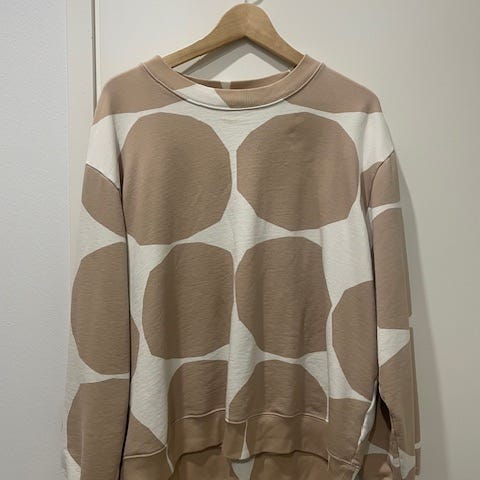 Uusi Marimekon raidallinen pusero, naisten koko M, valmistettu puuvillasta. Puserossa on raidallinen kuviointi sinisen ja oranssin sävyissä, nouto