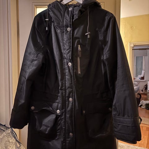 Musta, pitkä KHUJO talvitakki. Runsaasti taskuja. Lämmin. Koko: L.