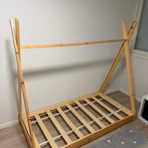 Myydään hyväkuntoinen ja erittäin vähän nukuttu talosänky. Koko 70x140. Ostettu Jollyroomista 2 vuotta sitten. Ainoa vika näkkyy kuvissa. Vika korjattu, ja on kestävä, eikä vaikuta nukkumiseen mitenkään.