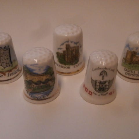 5 kpl keräilysormustimia, posliinia. Erilaisia vaakuna-aiheita. Korkeus n. 3 cm, halkaisija alareunassa 2,3 cm. Burnham on Sea, Bewdley, Cheddar Gorge, Appleby, ja Dublin. Kahdessa vaakuna-aihe on liimattu sormustimeen, muissa kuvina. Valmistajan leima sisäpuolella kaikissa. Ehjiä ja siistejä. Postitus tai nouto.