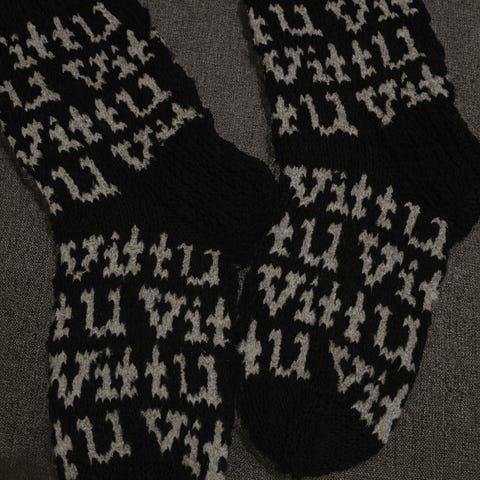 7-veljes langasta kudotut uudet villasukat. Näistä tuli itselle liian isot.