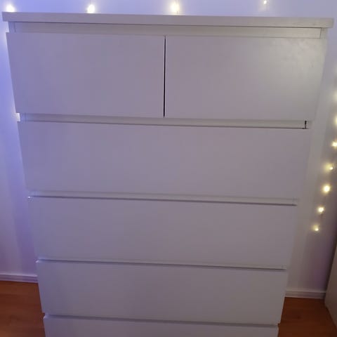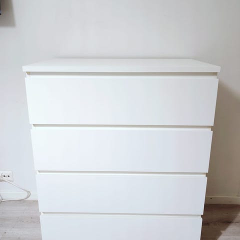 Malm lipasto kolmella laatikolla. Kahden laatikon pohjan takaosa on hieman irronnut eli laatikossa on ollut liian painavaa tavaraa.