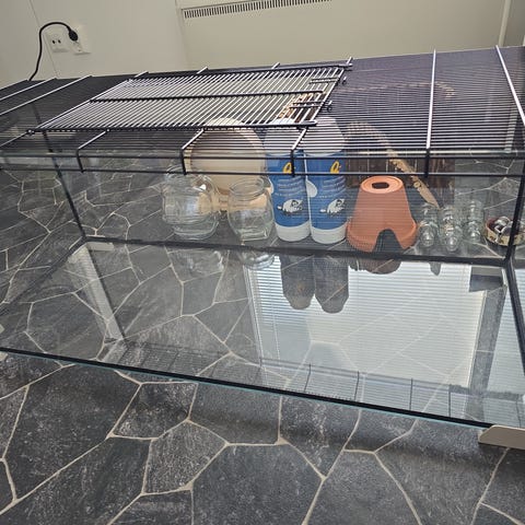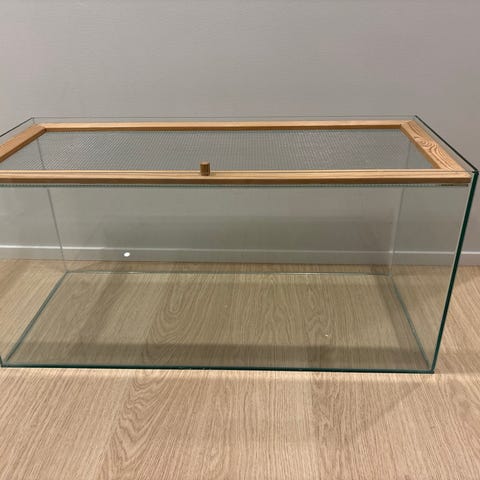 Terraario 110x50x55cm. Meillä käytetty päällä vain kanaverkkoa sellaisenaan mikä toiminut.