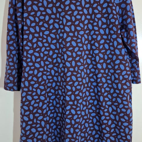 Materiaali on: 92 % puuvilla, elastaani 8 %. Mittoja: kainalo-kainalo = 56 cm ja pituus 90 cm, 3/4 hihat. Toimitus onnistuu Kouvolaan ja lähialueelle. Postikulut ostajalle.