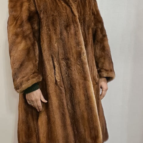 Kotimainen pitkä turkki kokominkkiä (urosminkki). Tumman ruskea, upea kiilto. Täysin ehjä, hyvin pidetty ja säilytetty. Sopii monelle kokonumerolle (M-L). Kainalo-kainalo 59 cm, pituus 116 cm. Kaulusta voi pitää auki tai kiinni turkisnapilla. 2 taskua.